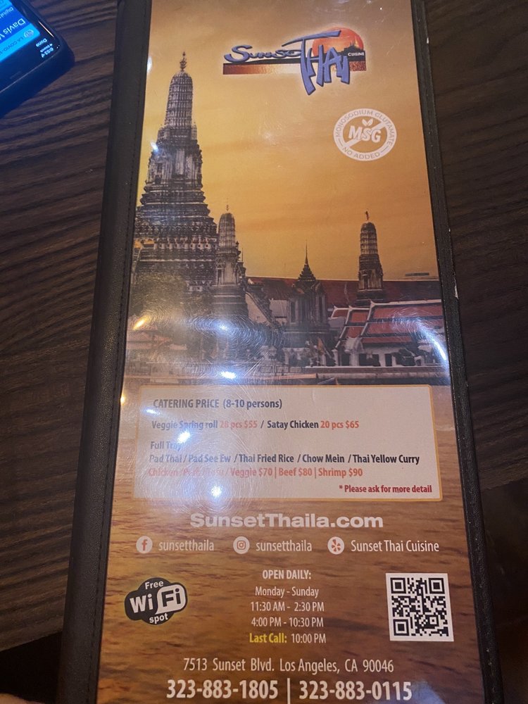 Sunset Thai Cuisine, located on Sunset Blvd in Los Angeles, offers a diverse menu of authentic Thai cuisine, coffee, and tea. The restaurant provides a range of utilities, from taking reservations to offering delivery and catering, making it a convenient dining option. With vegan options available and a welcoming atmosphere that is both casual and classy, Sunset Thai Cuisine caters to a variety of preferences. Customers have praised the flavorful dishes, with highlights including the curry dumplings, chicken satay, and Pad Thai. The friendly service adds to the overall dining experience, making it a go-to spot for many in the neighborhood. Whether for lunch or dinner, Sunset Thai Cuisine promises a satisfying meal with fast service and delicious flavors.